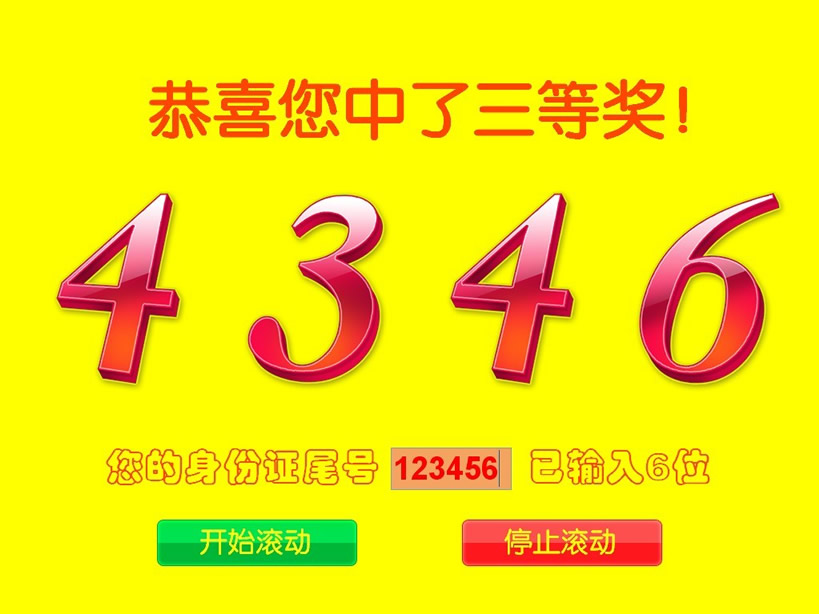 2、按回車鍵啟動滾動,按空格鍵停止?jié)L動顯示中獎號碼。